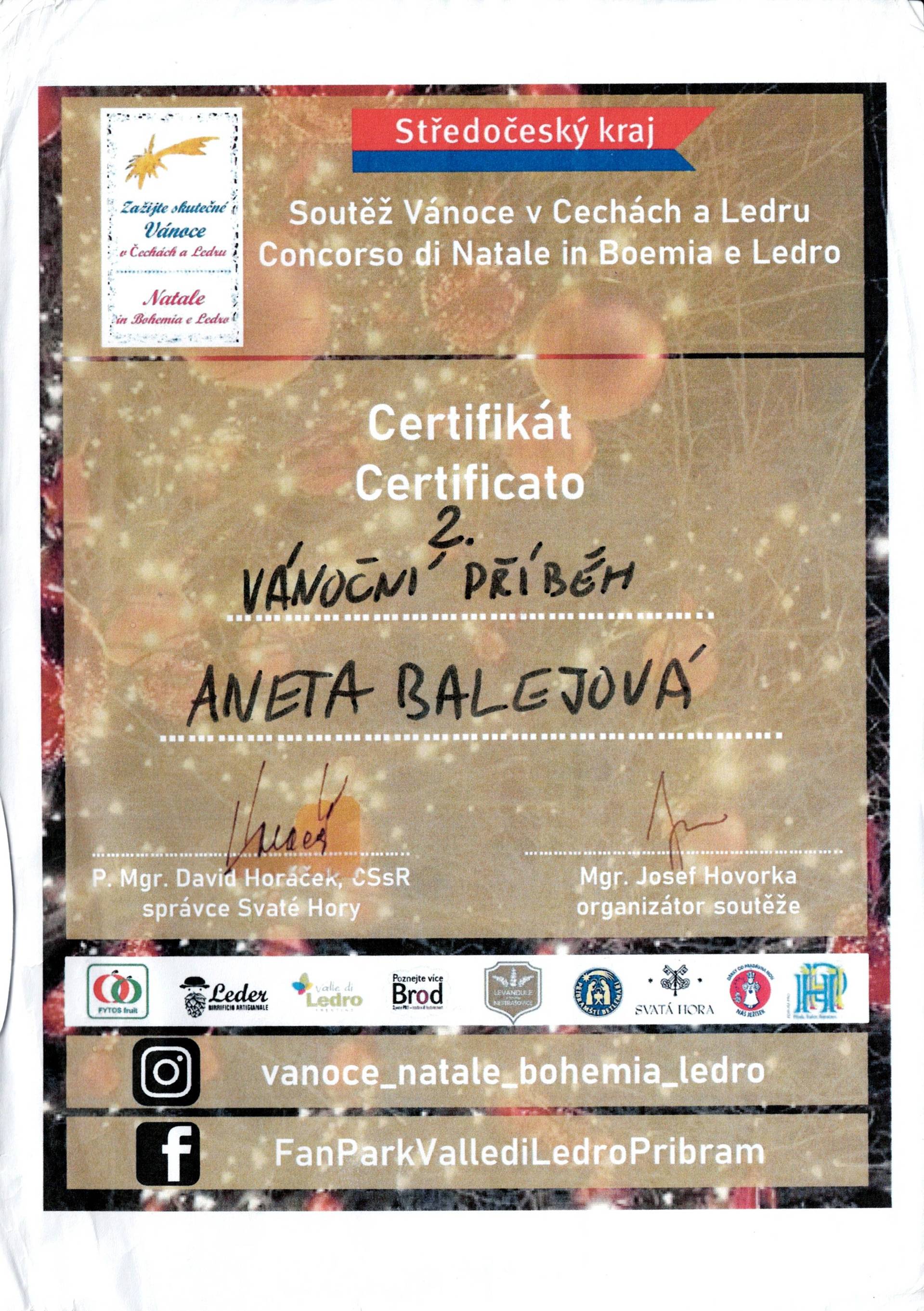 Mezi letošní vítěze tradiční vánoční soutěže "Vánoce v Čechách a Ledru" se dostala žákyně naší školy.  Sedmiletá Aneta Balejová byla ohodnocena 2. místem v kategorii Vánoční příběh.