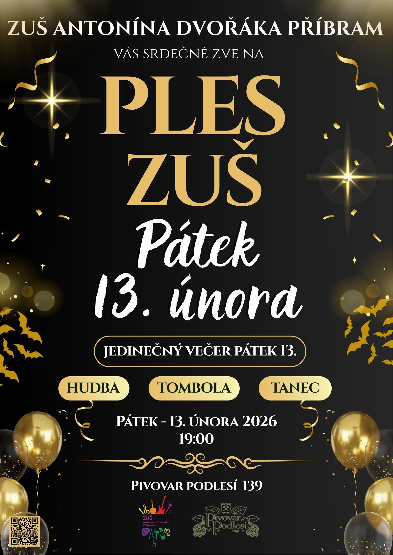 Srdečně vás zveme na tradiční Ples ZUŠ Antonína Dvořáka v Pivovaru Podlesí, který se uskuteční v pátek 13. února 2026 od 19:00 hodin. Přijďte si užít večer plný tance, dobré hudby a přátelské atmosféry v jedinečném prostředí.