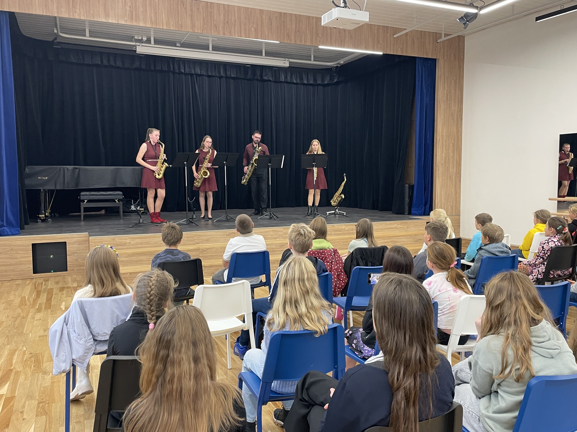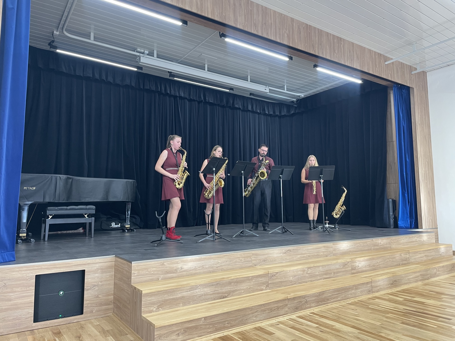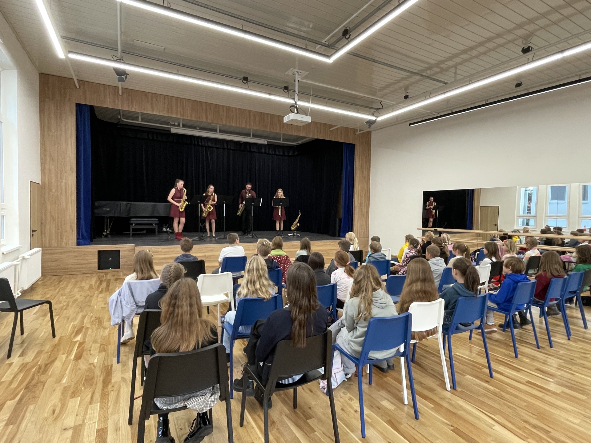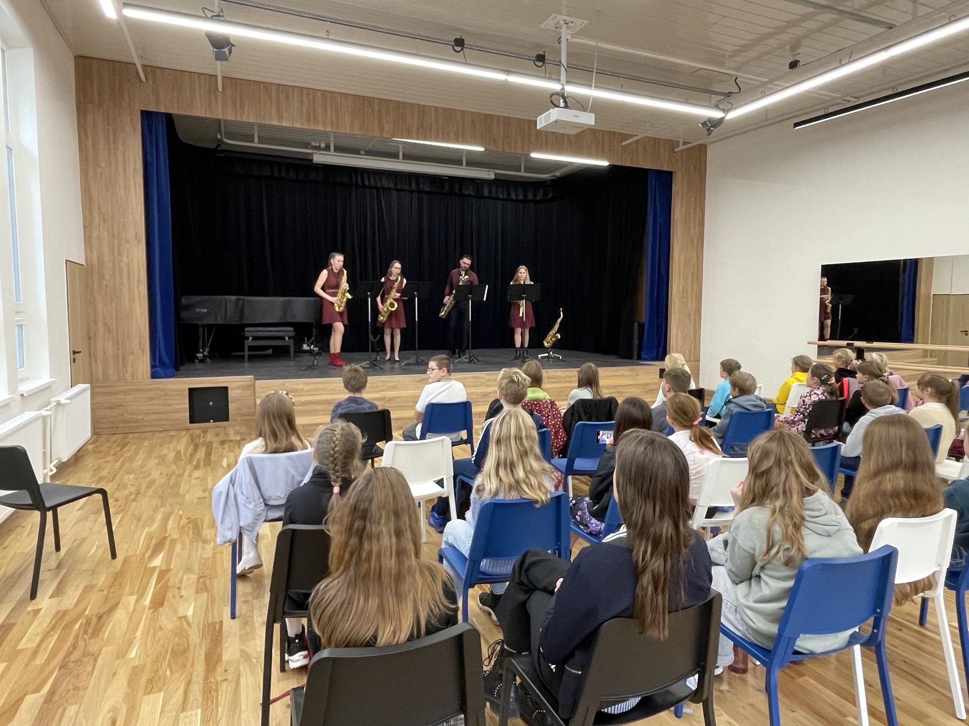 Představilo se saxofonové kvarteto DechBand pod vedením pana učitele Miroslava Maška. Žáci, z hudební nauky ze třídy paní učitelky Ivety Šmolíkové, si mohli vychutnat pestrý program napříč hudebními žánry – od klasické tvorby až po filmovou a populární hudbu.